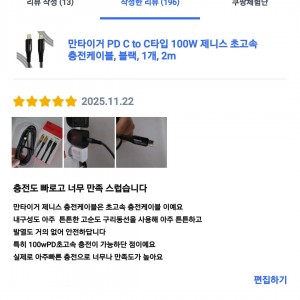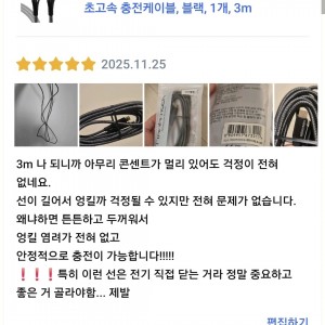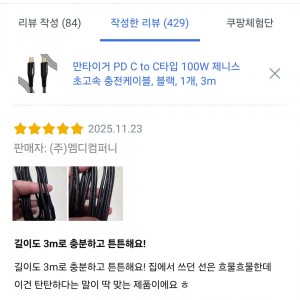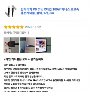 [상품평] 쿠팡_만타이거 PD C to C타입 100W 제니스 초고속 충전케이블 블랙 3m 1개