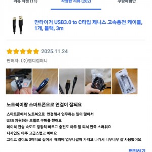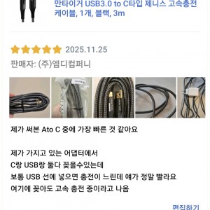 [상품평] 쿠팡_만타이거 USB3.0 to C타입 제니스 고속충전 케이블 블랙 3m 1개