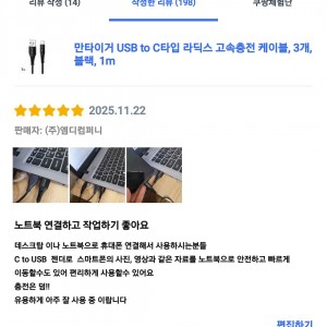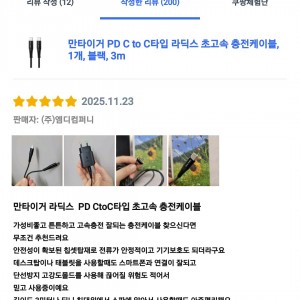[상품평] 쿠팡_만타이거 PD C to C타입 라딕스 초고속 충전케이블 블랙 3m 1개